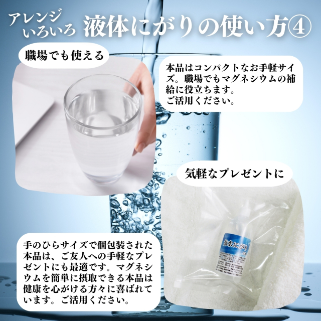 | 液体にがりについて | 苦汁(にがり)は、海水が含む塩化マグネシウムを主成分とする食品添加物で、主に伝統的な製法で作られ豆腐づくりに使われます。 マグネシウム(Mg)を豊富に含むことからサプリメントとして使われるほか、食品、スポーツドリンク、化粧品、化粧水、お風呂の入浴剤にも利用されます。 手軽でミネラル豊富なにがり水にも注目が集まっています。 |