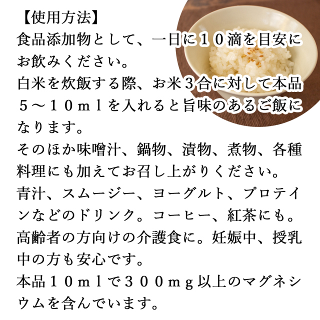| 使い方 | 食品添加物として、一日に10滴を目安にお飲みください。 本品10mlで300mg以上のマグネシウムを含んでいます。 白米を炊飯する際、お米3合に対して本品5~10mlを入れると旨味のあるご飯(ごはん)になります。 そのほか味噌汁(みそしる)、みそ汁、鍋物、漬物、煮物にも少量を加えてください。 青汁、スムージー、ヨーグルト、プロテインなどのドリンク。コーヒー、紅茶にもお使いいただけます。 高齢者の方向けの介護食、療養食、ソフト食としても使用できます。手作り料理レシピにおためしください。 妊娠中、授乳中の方も安心してお使いください。 手作り豆腐にもお使いいただけます。 |