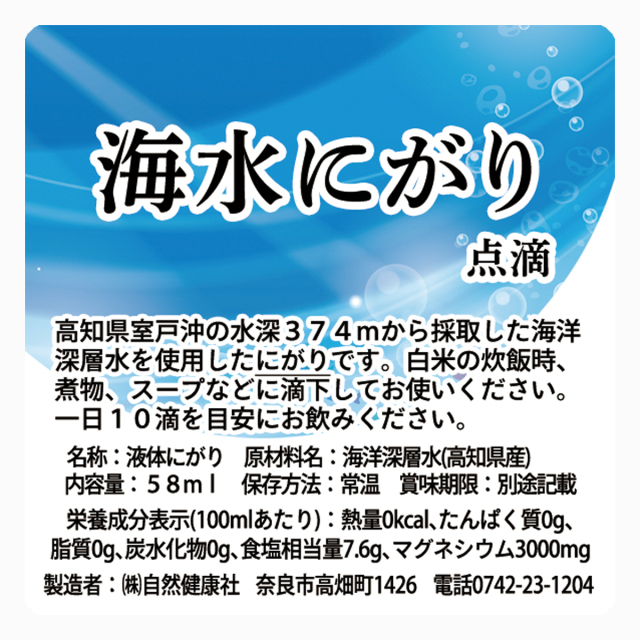 | 栄養成分(100mlあたり) | 熱量0kcal、たんぱく質0g、脂質0g、炭水化物0g、食塩相当量7.6g、マグネシウム3000mg、カリウム1600mg、カルシウム1250mg、ナトリウム3000mg、pH6.0 |