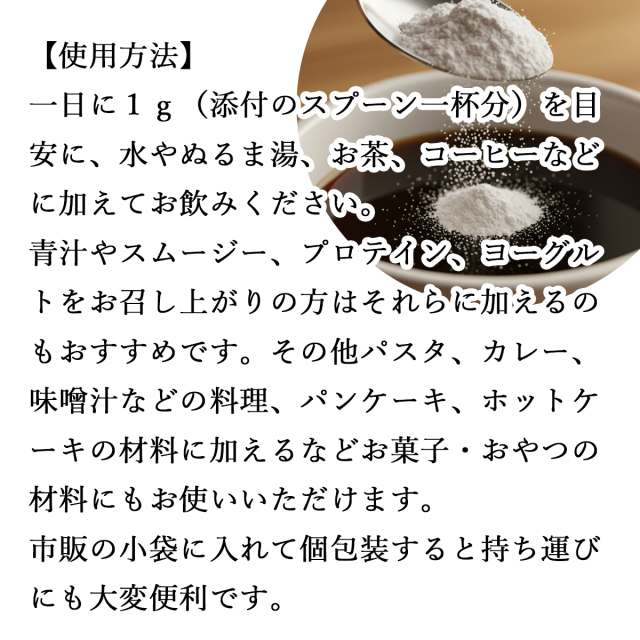 | 使い方 | 一日に1g(添付のスプーン一杯分)を目安に、水やぬるま湯、お茶、コーヒーなどに加えてお飲みください。 青汁やスムージー、プロテイン、ヨーグルトをお召し上がりの方はそれらに加えるのもおすすめです。 そのほかパスタ、カレー、味噌汁などの料理、パンケーキ、ホットケーキの材料に加えるなどお菓子・おやつの材料にもお使いいただけます。 市販の小袋に入れて個包装すると持ち運びにも大変便利です。 |