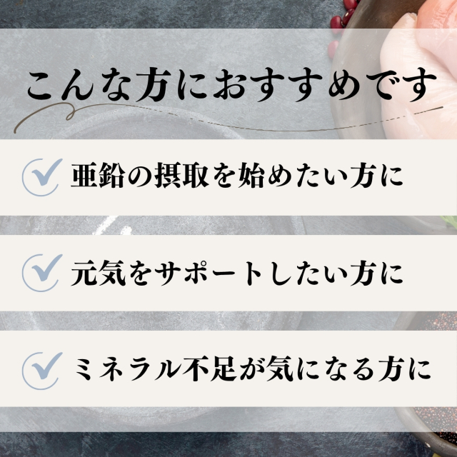 | 亜鉛について | 亜鉛は人の体内に約2g含まれていて、鉄の次に多い微量ミネラルです。 300種以上の酵素の働きに関わっていて、その働きは全身に及びます。 一般的な食べ物では牡蠣、うなぎを始めクルミ、アーモンドなどのナッツ。ごま、納豆などにも含まれています。 効率よく補給できるサプリメント(補助食品)が登場し、男性、女性を問わず口コミもあり注目されています。 |