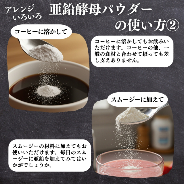 亜鉛を濃厚に含むサプリメントパウダーです。 1gあたり15mgの亜鉛を含んでいます。 一日に1g(添付のスプーン一杯分)を目安に、水やぬるま湯、お茶、コーヒーなどに加えてお飲みください。 保存に便利な広口容器入り。