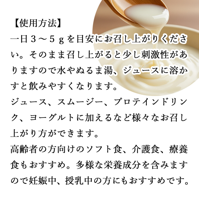 | 使い方 | 一日3〜5gを目安にお召し上がりください。 ジュース、スムージー、プロテインドリンク、ヨーグルトに加えるなど様々なお召し上がり方ができます。 解凍させてペーストにし、高齢者の方向けのソフト食、介護食もおすすめです。 多様な栄養成分を含みますので妊娠中、授乳中の方にもおすすめです。 |