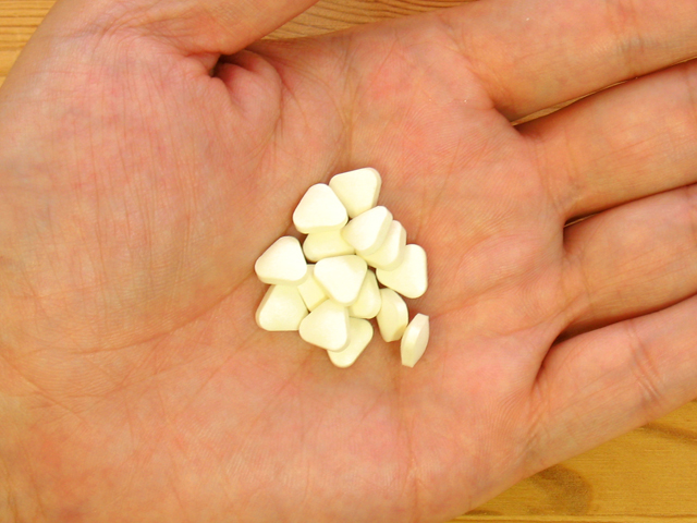 「キチン・キトサン粒」三角形状ですが角が丸くなっているため、のどにつかえることもなくスムーズに飲み込めます。