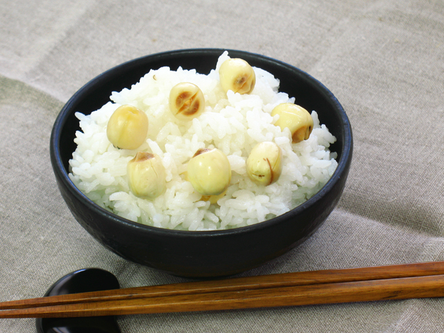 ハスの実ごはんは、ハスの実の香ばしさと甘さが混在し、とてもおいしいです。栗ご飯のような感覚ですね。-