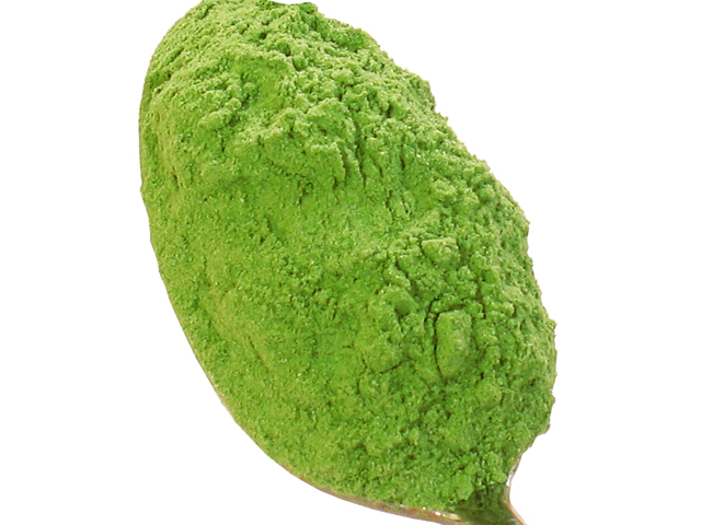 スプーンですくって野草の青汁を確認します。とても細かい微粉末です。野生の葉緑素がふんだんに含まれています。