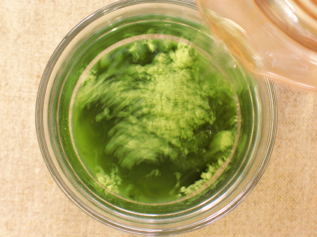 ティースプーンでよくかき混ぜます。よもぎ新芽粉末はサッと水になじみ、少しかき混ぜるだけで完全に混ざります。